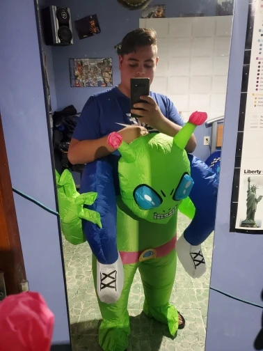 Das Kostüm wird mit einer mitgelieferten Pumpe betrieben, damit das Kostüm immer voll aufgeblasen ist.