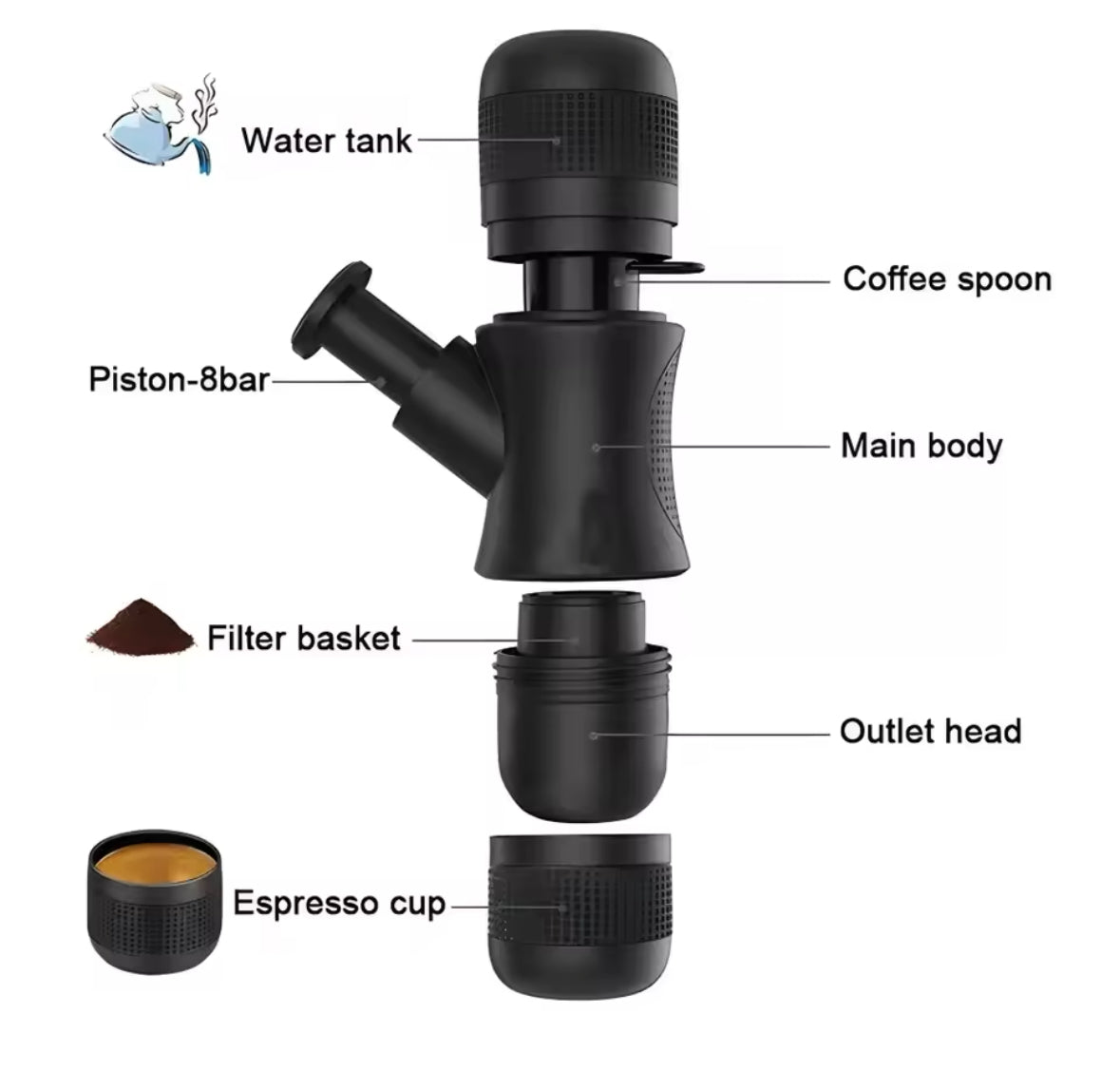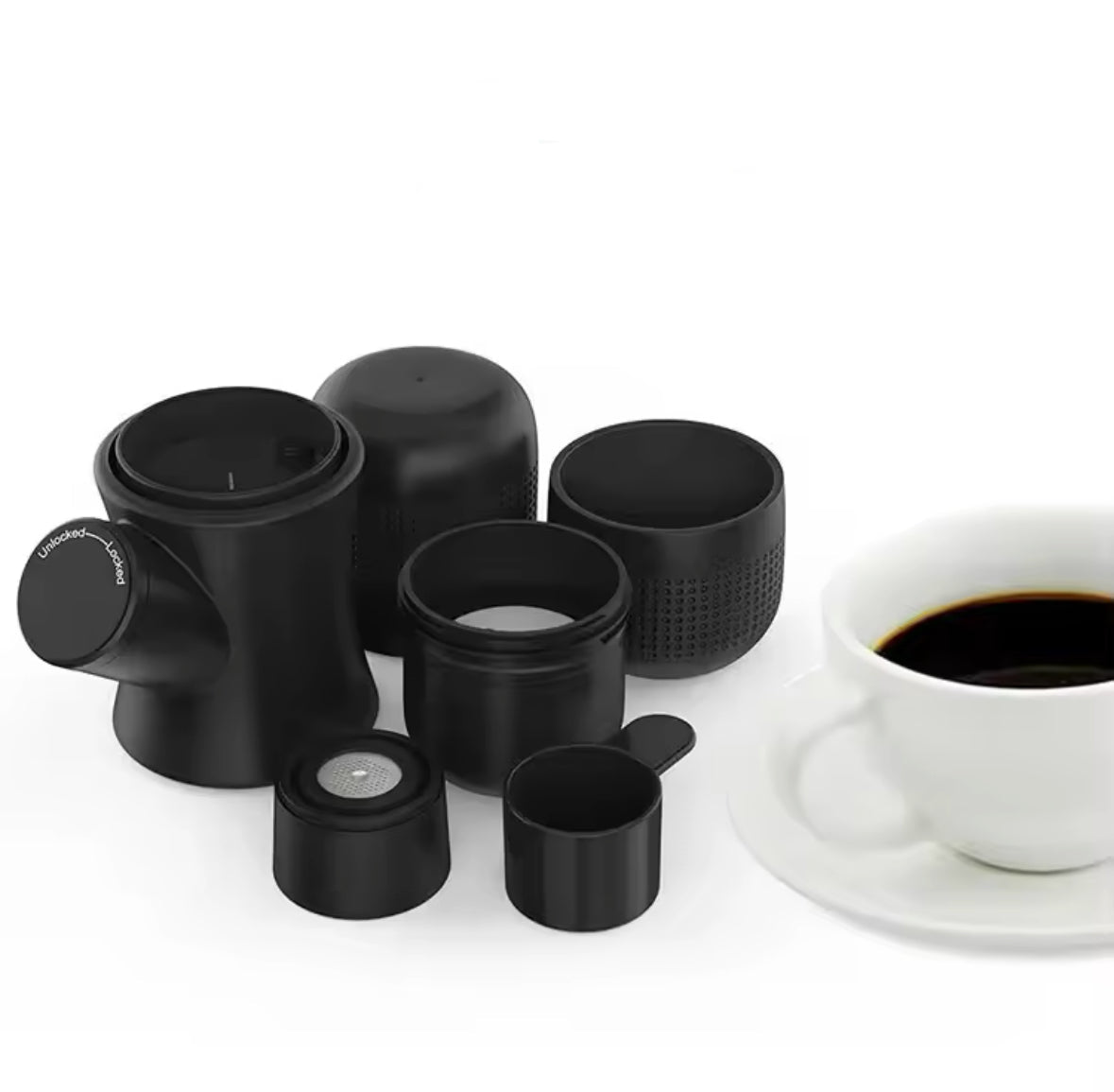 Geniessen Sie Ihren Kaffee unterwegs mit der mobilen Kaffee Maschine! Egal ob Kaffee, Espresso oder Coldbrew, dank der Manuellen Pumpe werden Sie nie mehr auf Ihren Koffeinkick verzichten müssen. Benutzen Sie dafür Ihr Lieblings Kaffeepulver!