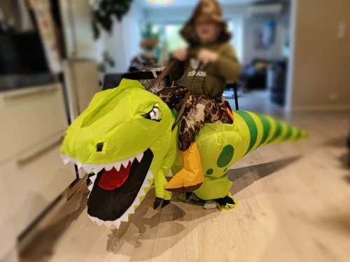 Der Dino wird mit einer mitgelieferten Pumpe betrieben, damit das Kostüm immer voll aufgeblasen ist.
